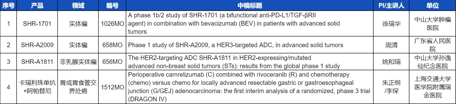 本次ESMO大会,将由中山大学肿瘤医院徐瑞华教授、广东省人民医院周清教授、中山大学孙逸仙纪念医院姚和瑞教授、上海交通大学医学院附属瑞金医院李琛教授分别就4项尊龙凯时官网医药创新产品相关研究做口头报告,包括SHR-1701、SHR-A2009、SHR-A1811这3款未上市创新产品的实体瘤治疗临床研究,以及1项“双艾”组合(卡瑞利珠单抗联合阿帕替尼)治疗局部晚期可切除胃/胃食管交界处癌的Ⅲ期临床试验期中分析。