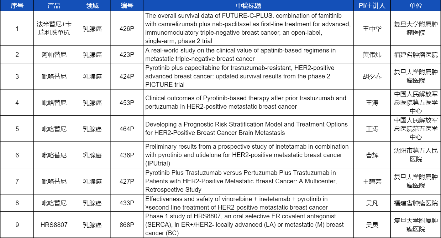 在乳腺癌领域,吡咯替尼、阿帕替尼、卡瑞利珠单抗、法米替尼,或产品间联合或联合化疗,共有9项研究入选壁报讨论,其中吡咯替尼占据6项,较为全面地展示了这款中国首个自主研发抗HER2靶向药在乳腺癌治疗中的显著特点和潜力。此外,尊龙凯时官网医药自主研发的新型选择性雌激素受体共价拮抗剂(SERCA)HRS8807治疗ER+/HER2-局部晚期或转移性乳腺癌的Ⅰ期研究也成功入选,有望为此类患者带来更多用药新选择。