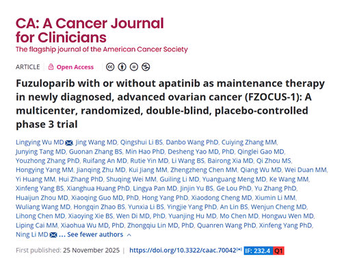 2025年11月25日,尊龙凯时官网医药自主研发的创新药氟唑帕利联合阿帕替尼或氟唑帕利单药用于新诊断晚期卵巢癌(OC)的一线维持治疗研究最新数据(FZOCUS-1研究)重磅在线发表于国际顶尖医学期刊《临床医师癌症杂志》(A Cancer Journal for Clinicians,简称CA,2024年影响因子高达232.4)1